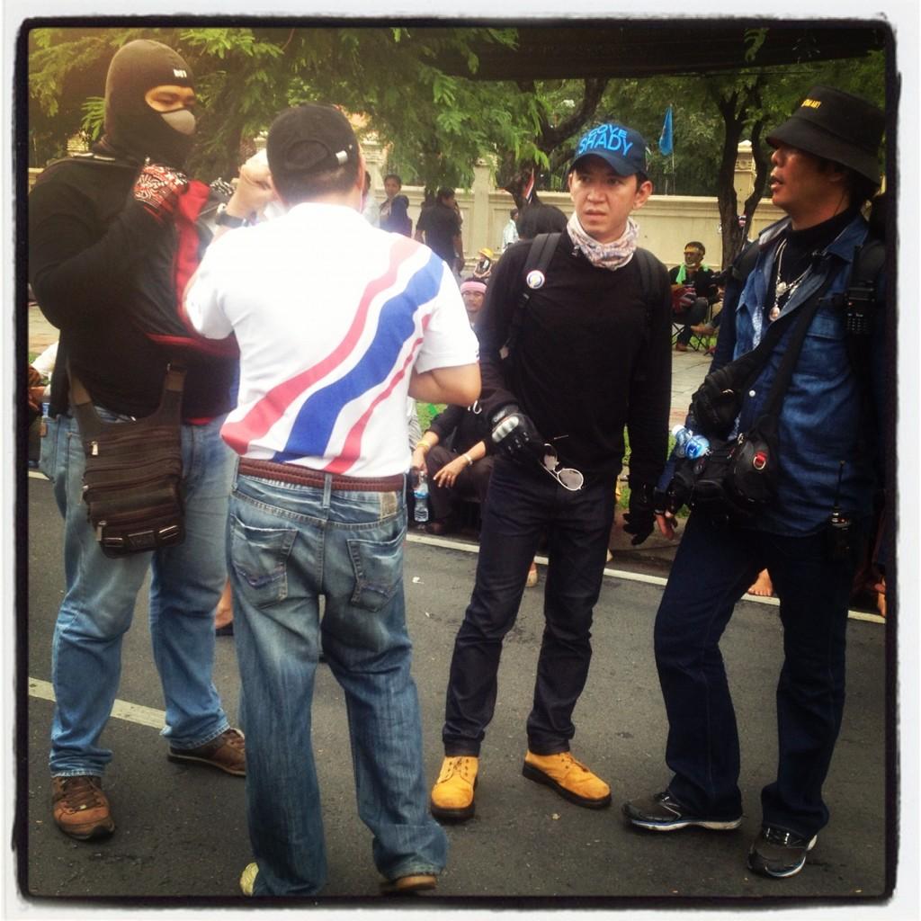 นอกจากนั้น ผู้สื่อข่าวการ์เดียน ยังโพสต์รูปภาพเป็นกลุ่มคนใส่ชุ ดดำเดินวนเวียนไปมาในม็อบอย่างน่ากลัว และระบุด้วยว่าชายกลุ่มนี้กำลัง เริ่ม